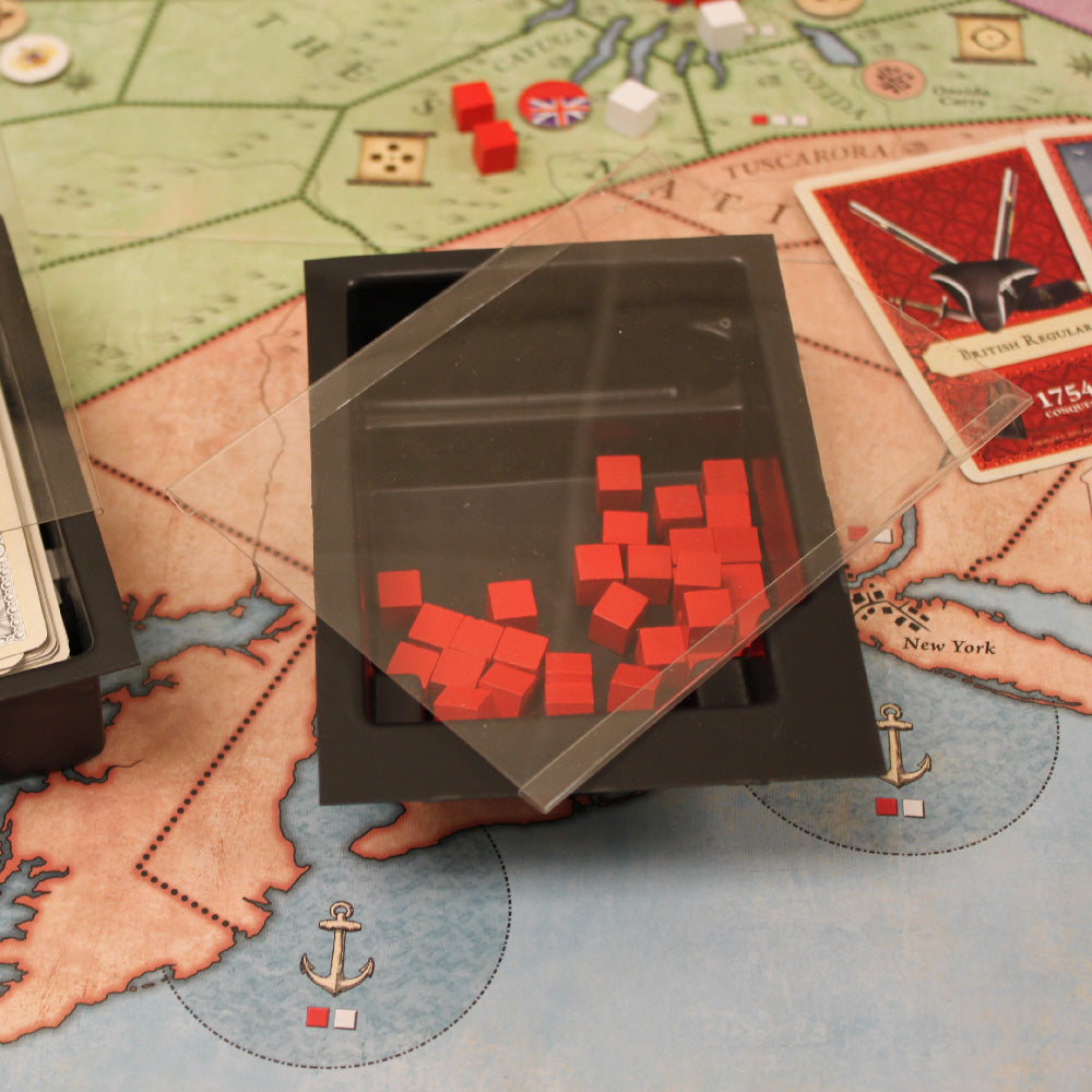 Each tray lid pack contains six covers, which slide over top of each organizer tray, to hold cubes/miniatures, dice, and cards inside each faction tray.